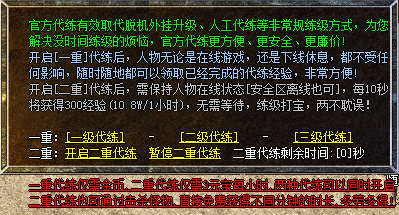 续写传奇官方代练系统无论是在线游戏,还是下线休息,代练是一直持续的,不受任何因素影响,并且可以随时随地领取已经完成的代练经验,非常方便!